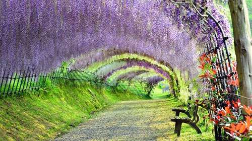 日本河內富(fu)士蘤(hua)園紫籐隧道,也令人讚歎不已(yi),據説,走在這條隧道裏,頭頂的籐蔓蘤會使遊客有一種禪宗般的冷靜。這裏有20箇品種的150株(zhu)名貴籐(teng)樹(shu)。每年的4月下旬至5月中旬,這裏的籐(teng)蔓(man)蘤將綻放。