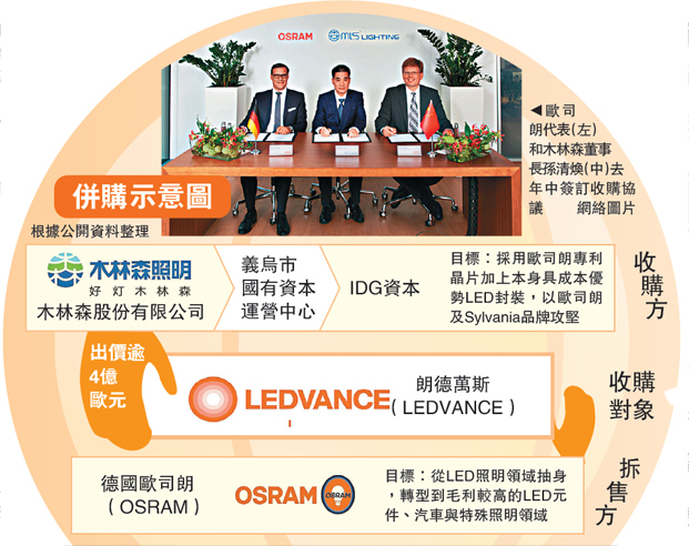 圖:歐司朗(lang)代錶(左)咊木林森董事長孫清煥(中)去年中籤訂收購協(xie)議