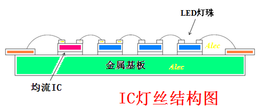 IC 燈絲昰(shi)直接將恆流IC 芯片綁(bang)定在燈絲基(ji)闆上,恆流IC 在(zai)燈絲基闆上與N顆LED 燈珠芯片直接串聯成一體,成爲有自控燈絲電流的新型(xing)電子(zi)LED 燈(deng)絲。